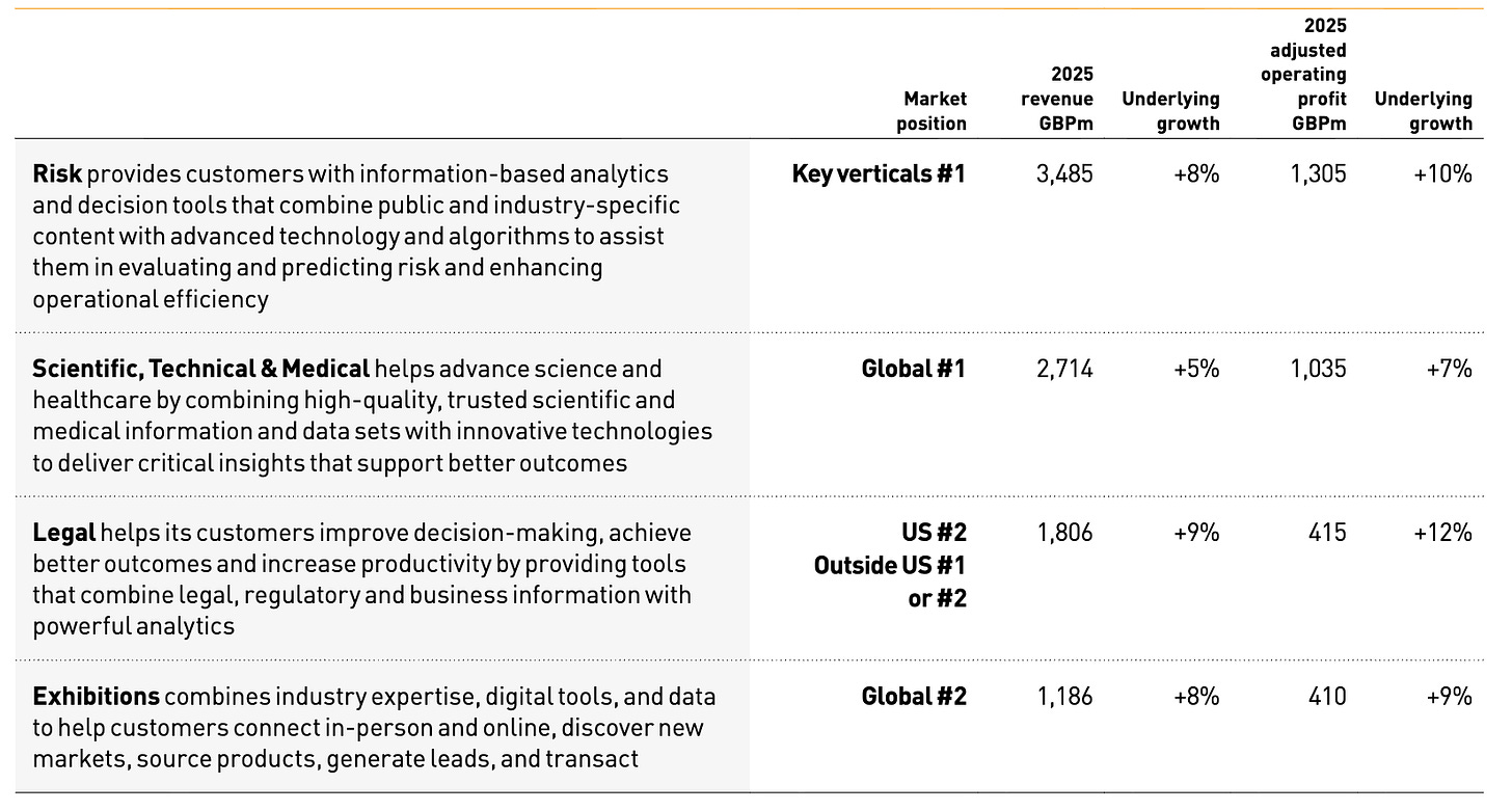RELX contains many different types of business units within it, of which Elsevier’s journals programme is a (relatively) small proportion. So don’t let the RELX headline figure of £9.6 billion in revenues (+7% vs 2024) and £3.3 billion of adjusted operating profit1 (+9% vs 2024) mislead you. RELX was called Reed Elsevier up until 2015, which caused no end of confusion: these top-level financials are for the parent company, not Elsevier itself.