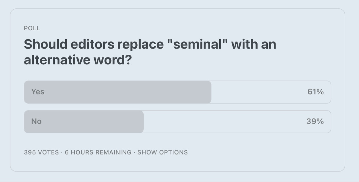 Last week I asked you to vote on whether editors should replace ‘seminal’ with an alternative word (if you missed last week’s issue, you can read the rationale here). Nearly 400 of you voted with 61% voting “yes”. Style guides will need updating.