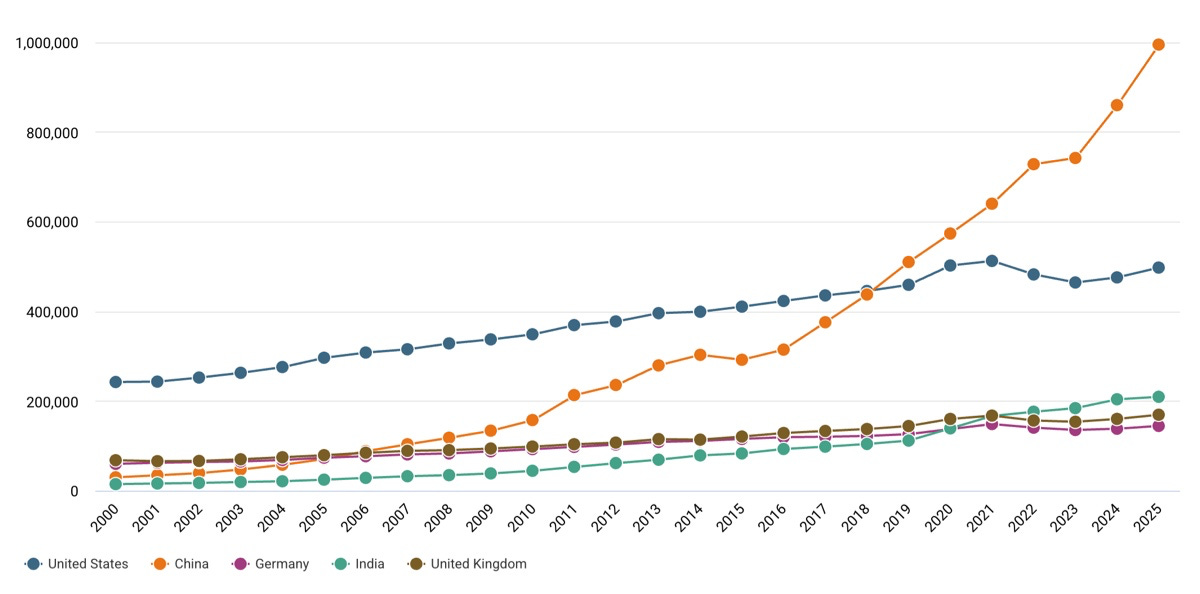 Many publishers are in denial about the shift in the balance of scientific power, from the west to east. As a reminder, China published twice as many research papers as the USA last year, hitting the 1 million article mark for the first time (the 2025 article numbers in the below graph will get larger as more 2025 content is added to the Dimensions database over the next 6 months).