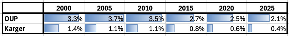 Between 2000 and 2025 Karger’s market share dropped from 1.4% to 0.4% and OUP’s fell from 3.3% to 2.1%. Acquiring Karger will bring OUP back to where it was in 2020, but it will still be significantly behind the high point of 20 years ago.