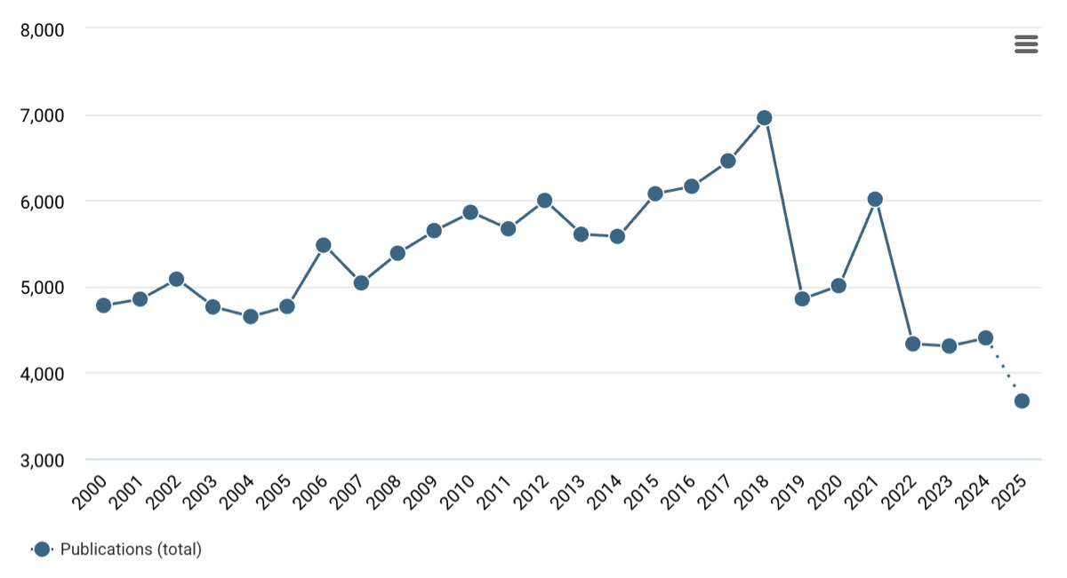 The increase in 2018 (and fall in 2019) is due, in large part, to one journal, Cellular Physiology and Biochemistry, which grew rapidly off the back of submissions from China, but had problems with paper mills; it is no longer published by Karger. The dotted lines for 2025 represent the year-to-date article volume.
