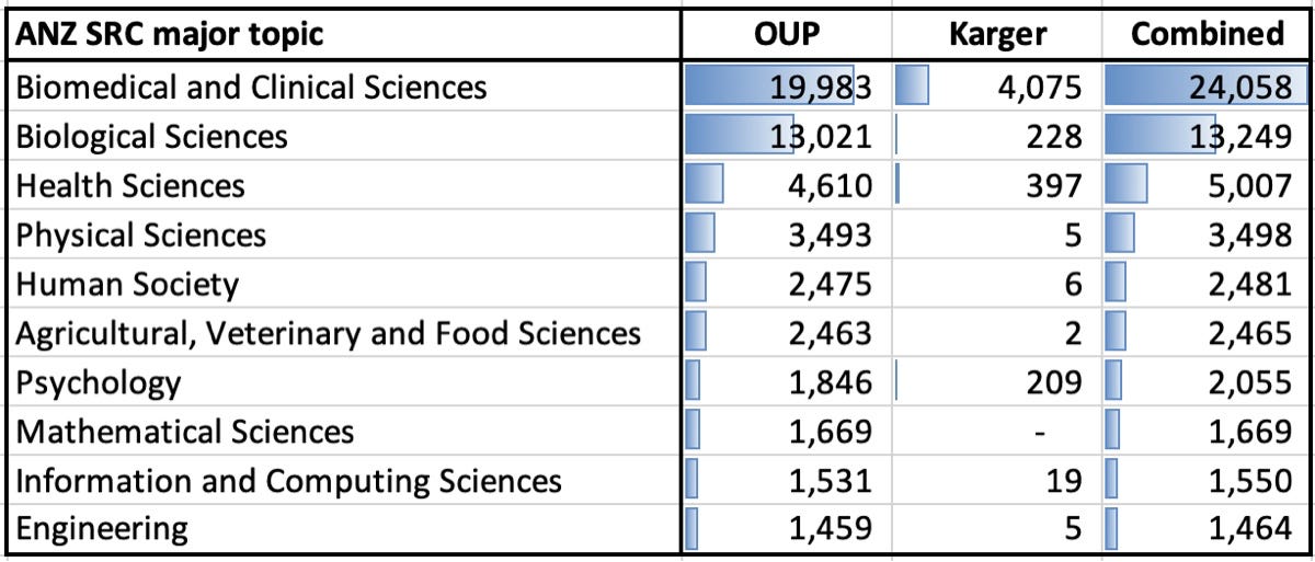 The next table shows the number of research articles and reviews published in 2024 for each of the two publishers. OUP publishes relatively few papers in the physical, chemical and applied sciences; this acquisition adds to its core strengths rather than expanding it into new areas.