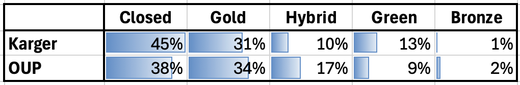 The difference in hybrid percentages may be due to the fact that Karger has 28 transformative agreements listed in the ESAC transformative agreement registry, whereas OUP has 64. (N.B. The ESAC registry is based on self reporting by participating institutions and may not provide an accurate view of the transformative agreement landscape.)