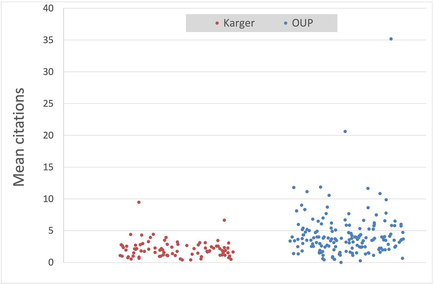 As you can see from the scatter plot, all bar two of the Karger journals sit below the “5 mean citations” horizontal line. OUP, by contrast, has a large number of biomedical and clinical journals that sit above that line.