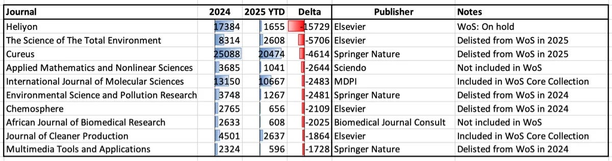 The table below shows the 10 journals that shrank the most in 2025 compared with 2024 (taken from this Journalology newsletter from December 2025). Heliyon tops the chart.